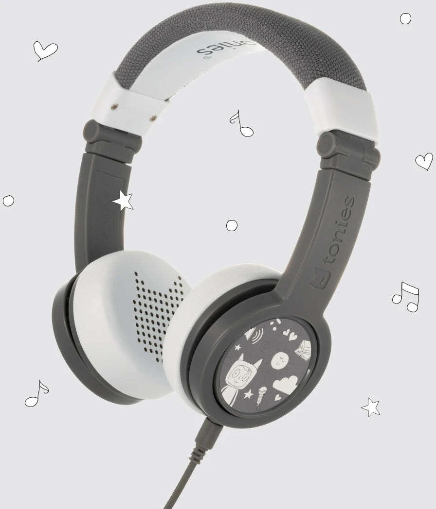 Meet the tonies® Headphones! These foldable, durable, kid-safe, volume-limiting headphones come in six colors to match your Toniebox. Each headphone set includes a matching sticker set and a detachable audio cable with a BuddyJack splitter for sharing storytime with up to four sets of headphones from a single Toniebox.