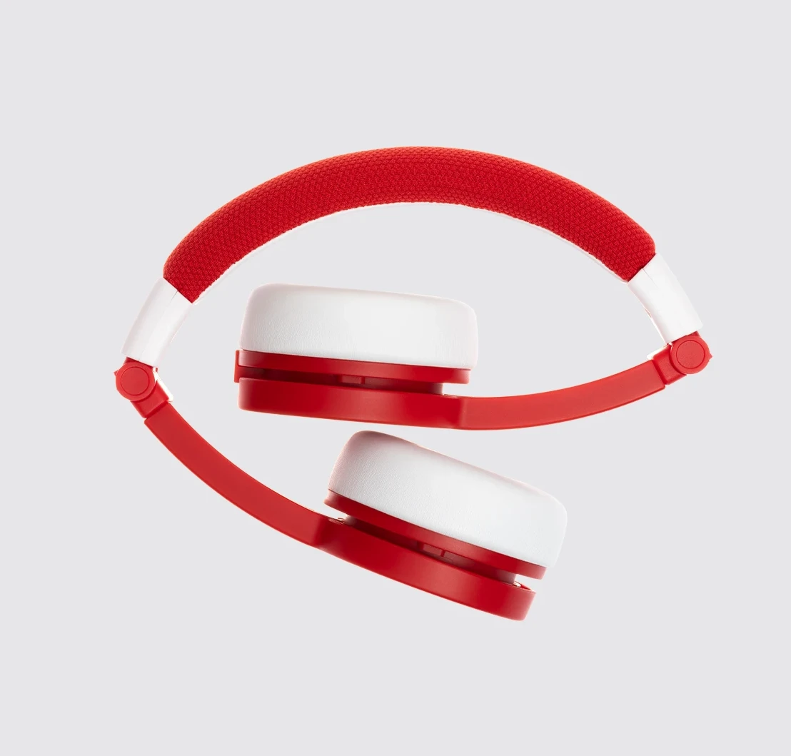 Red Tonies Headphones! These foldable, durable, kid-safe, volume-limiting headphones come in colors to match your Toniebox. Each headphone set includes a matching sticker set and a detachable audio cable with a BuddyJack splitter for sharing storytime with up to four sets of headphones from a single Toniebox.